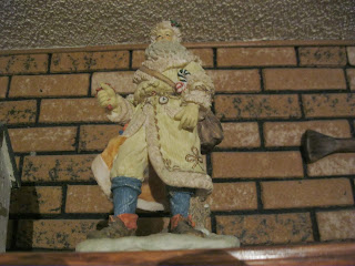 An old sewing machine bought in Wyoming, a basket bought in Alaska, an old sprinkler bought in Tennessee, a Santa bought in Tennessee, and the bird sitting on the floor until after the holidays..............